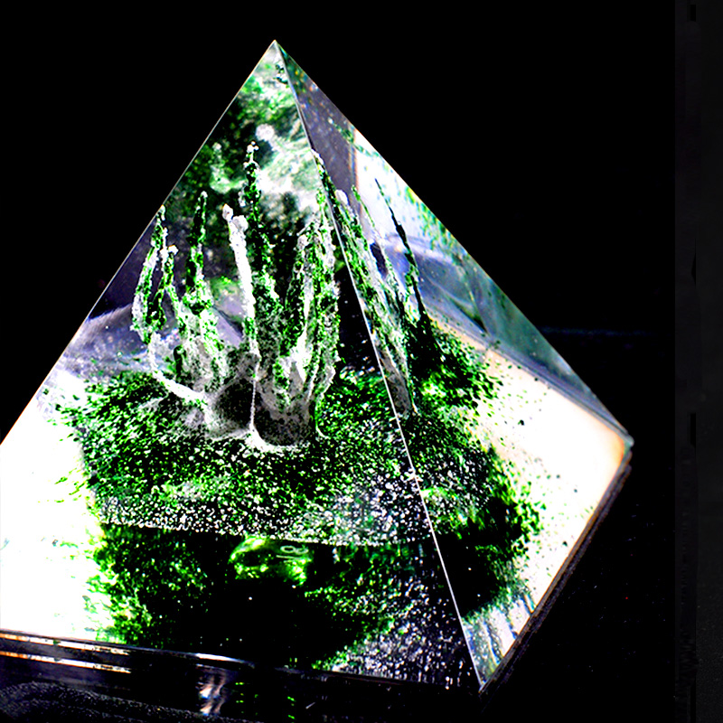Die Asche des Verstorbenen wird direkt in eine Pyramide aus hochqualitativem böhmischen Kristallglas verschmolzen. Der Kristall wird weiter veredelt und von Hand geschliffen und poliert. Dieser Gedenkkristall wird in zwei Varianten angeboten: Kristallglas mit Asche oder kombiniert mit Farbe. Ein Text kann auf das Glas sandgestrahlt werden. Jeder Gedenkkristall ist ein handgefertigtes Unikat und kann sich daher von der Abbildung leicht unterscheiden.